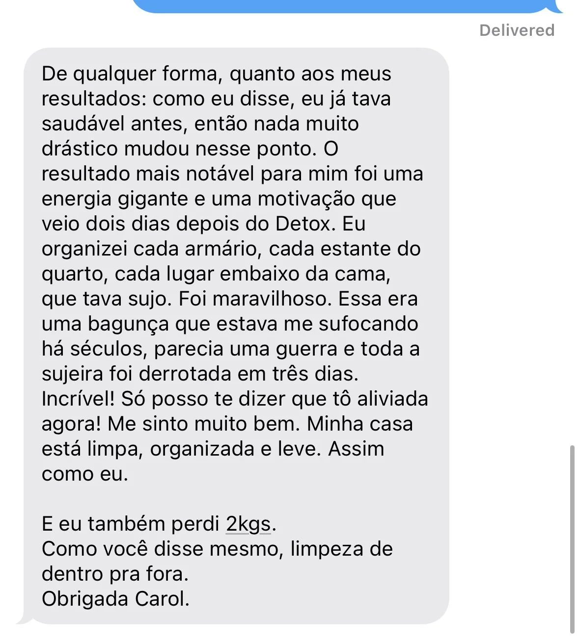 Bom, como tudo na vida, você vai levar desse detox o tanto de esforço e dedicação que você colocar em realmente fazer o que precisa ser feito. Eu vejo sim resultados consistentes, mas eles são individuais e diferentes uns dos outros. Eu realmente acredito que você tem o resultado que você mais precisa no momento… seja ele mais energia, barriga desinchada ou até uma mudança de vida completa!