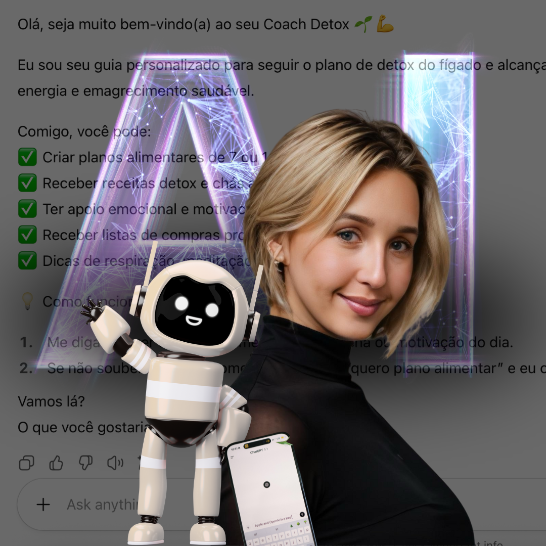 Imagine ter um assistente pessoal que te apoia 24h/dia: monta seu plano alimentar, indica chás e receitas, motiva você e te ajuda a se manter firme no seu detox de forma simples e carinhosa. Esse é o Coach Detox — sua IA amiga, com o meu toque super especial.